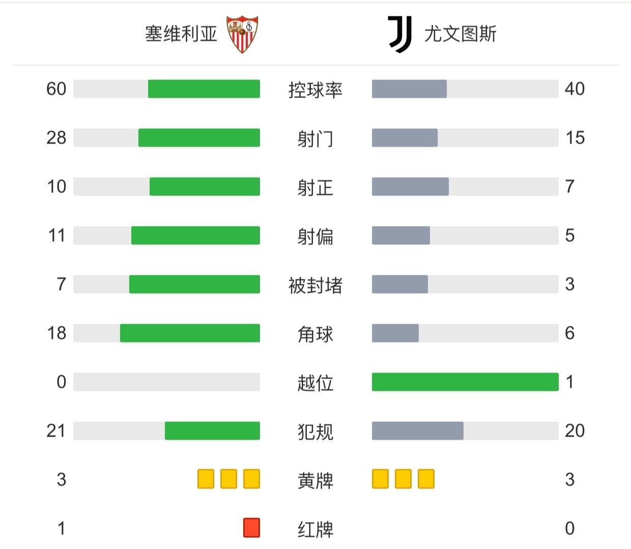 全场比赛结束,最终塞维利亚2-1尤文图斯。