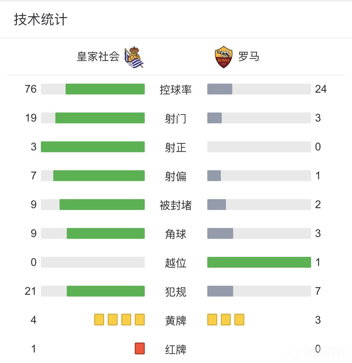 全场比赛结束,罗马客场0-0战平皇家社会,总比分2-0晋级八强。