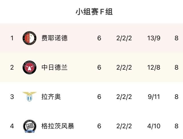 24直播网11月04日讯 凌晨,欧联杯F组结束了最后1轮的争夺。最终费耶诺德主场1-0战胜拉齐奥,中日德兰主场2-0战胜格拉茨风暴。这一比分结果,也知道导致该组末轮后,出现了4支球队同积8分的奇景。