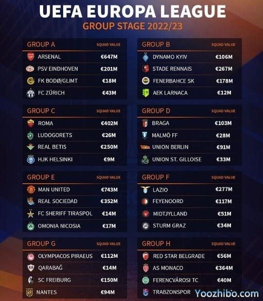 2022-2023欧联杯小组分组及各队身价:欧元,加粗为身价超1亿欧元的球队