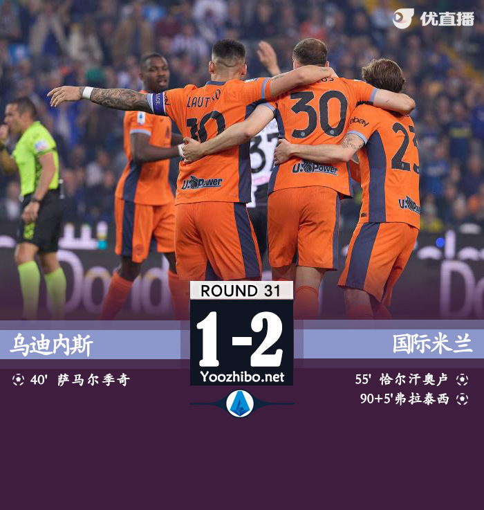 24直播网讯:北京时间4月9日意甲联赛第31轮,乌迪内斯主场对阵国际米兰。上半场,萨马尔季奇似传似射,皮球慢悠悠滚入球网。下半场,图拉姆造点,恰尔汗奥卢主罚扳平比分。补时阶段,劳塔罗射门击中立柱弹出,弗拉泰西补射绝杀。全场比赛结束,国米2-1逆转击败乌迪内斯,14分优势领跑意甲。