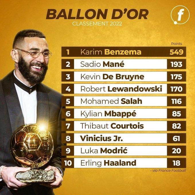 本泽马的得分比2-4名得分总和还多了11分,第二名马内193分,第三名德布劳内175分,第四名莱万多夫斯基170分。