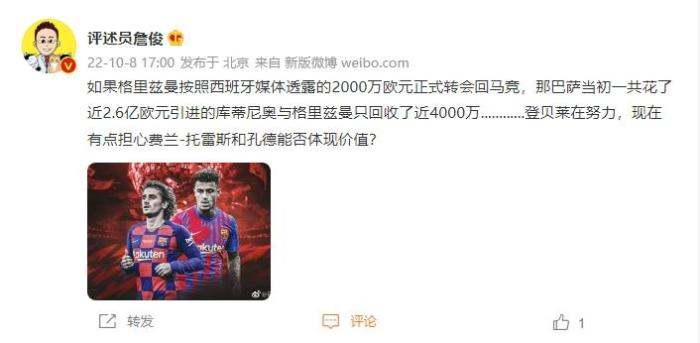 詹俊在个人微博上写道:如果格里兹曼按照西班牙媒体透露的2000万欧元正式转会回马竞,那巴萨当初一共花了近2.6亿欧元引进的库蒂尼奥与格里兹曼只回收了近4000万............登贝莱在努力,现在有点担心费兰-托雷斯和孔德能否体现价值?