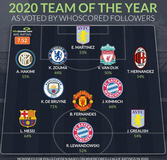 如图,这是whoscored让球迷评选的足坛2020年度最佳阵容,其中门将位置上是维拉门将马丁内斯,他拿到了53%的选票。而后防线上四人分别是国米的哈基米,他拿到了55%的选票;切尔西的祖马,他拿到了44%的选票;利物浦的范迪克,他拿到了50%的选票;米兰的埃尔南德斯,他拿到了54%的选票。这些球员都是被球迷认为2020年度表现最好的后防线上的球员。