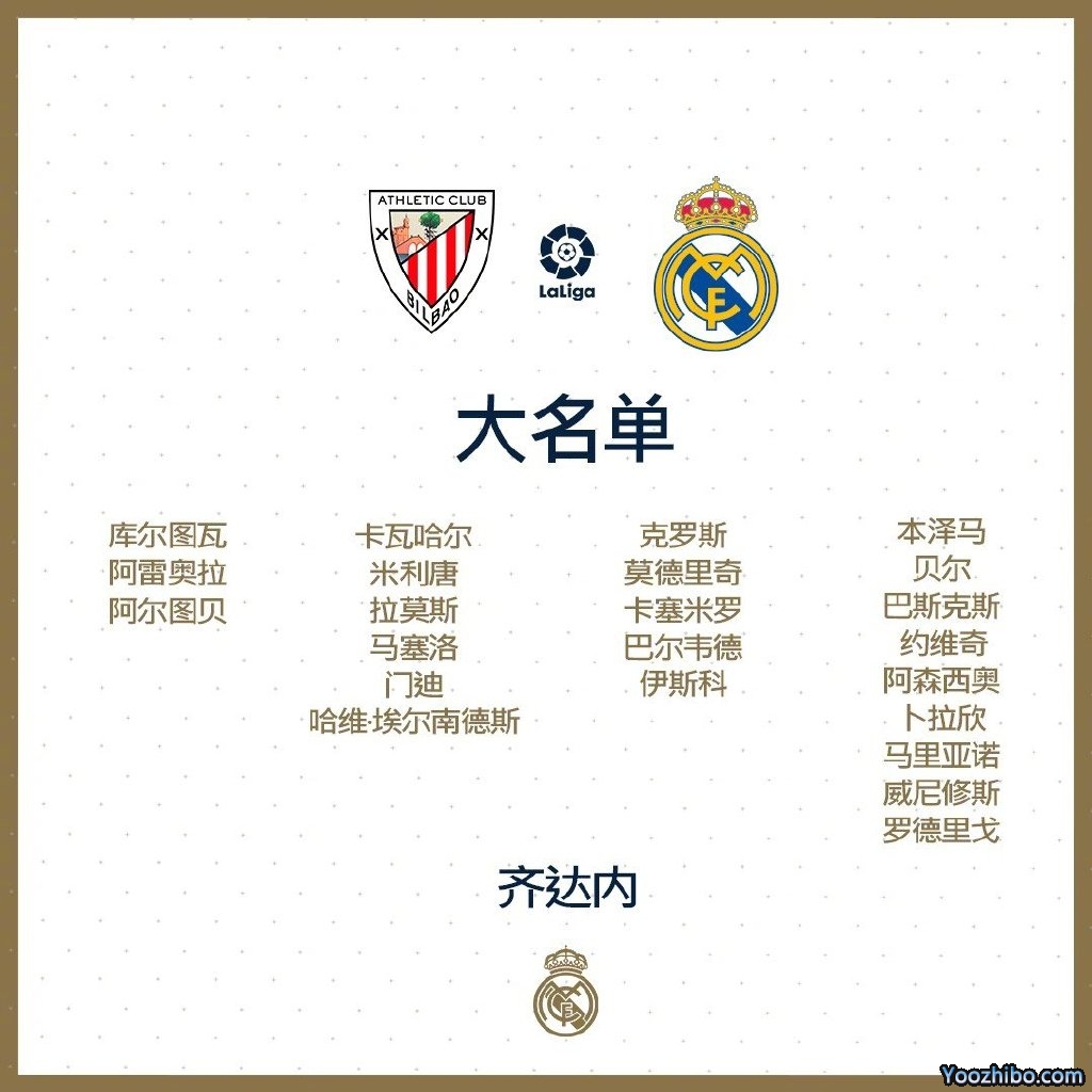 皇家马德里vs毕尔巴鄂大名单:本泽马领衔 阿扎尔伤缺!