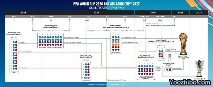 两个阶段的联合预选赛后,2027年亚洲杯预选赛将与2026年世界杯预选赛同期进行:
