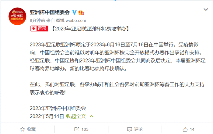 24直播网05月15日讯 消息,2023年亚洲杯组委会官方宣布,因为疫情影响,2023年亚洲杯将易地举办,新的举办地点有待确认。对于中国足球来说,这是一个遗憾,毕竟时隔19年,原本中国男足可以在家门口再次出战亚洲杯,但是受到各方面因素影响,亚洲杯将无法在中国举办。