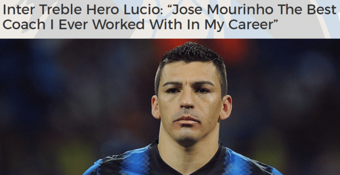 卢西奥曾与穆里尼奥一起在国米赢得三冠王,谈及这位教练,卢西奥说道:“穆里尼奥对我来说非常重要,他是一个能够激发出每一个人最好一面的激励者。”