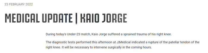 24直播网02月24日讯 据尤文图斯官方消息,球队新援凯奥-若热右膝髌腱断裂将接受手术治疗,根据跟队记者消息,球员赛季报销,预计缺阵半年。