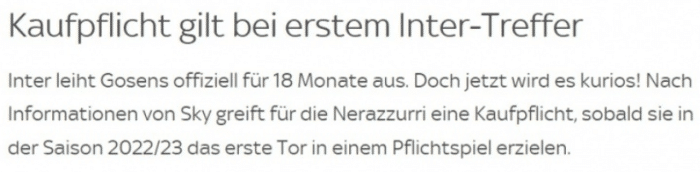 在2022-23赛季,国米打进正式比赛的第一粒进球时,戈森斯的强制买断条款就会触发,国米需要支付2500万欧元将其买断。