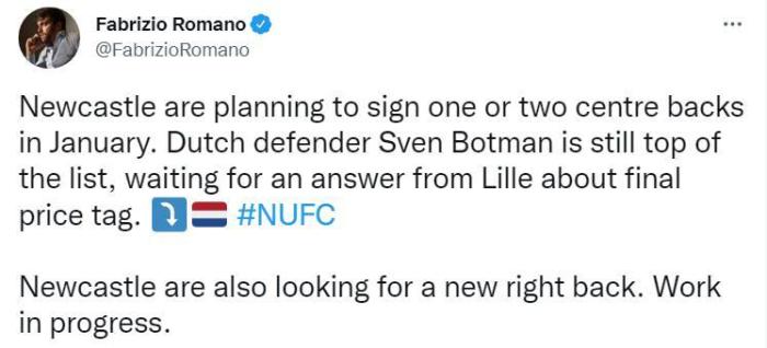 罗马诺表示,纽卡斯尔联计划在1月签下1-2名中卫,博特曼仍然是他们的首选,他们正在等待里尔对最终报价的回复。