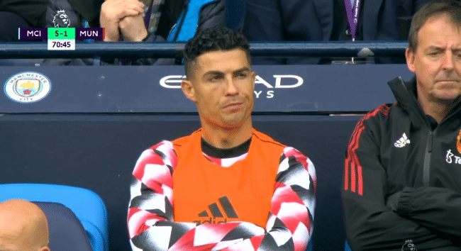 C罗求战的欲望是非常强烈的,下半场滕哈赫大手一挥,C罗去到场边热身,当时球队1-4落后,看到希望。无奈C罗热身之后,曼联1-5落后,滕哈赫安排的是马夏尔和卡塞米罗登场,C罗继续坐在替补席上,镜头对准C罗,他对于这样的决定很显然是不满的。C罗本赛季在曼联,从之前的队内射手王,已经彻底沦为替补了。