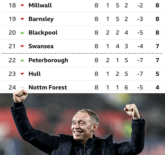 诺丁汉森林在本赛季英冠开局8轮,仅仅赢了1场比赛,取得1胜1平6负的糟糕战绩,排名英冠第24位,也就是倒数第一;