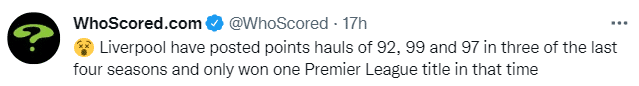 WhoScored统计表明,利物浦近4个赛季有3次在英超拿到超过90分,分别是92分,99分和97分。
