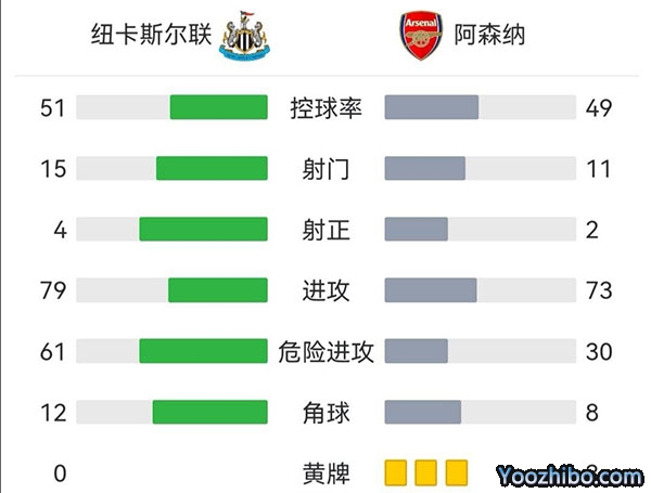 全场比赛结束,纽卡斯尔2-0阿森纳。