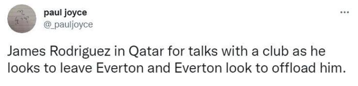 24直播网讯据英国媒体《泰晤士报》记者PaulJoyce报道,哥伦比亚中场哈梅斯-罗德里格斯正在与一支卡塔尔球队谈判。