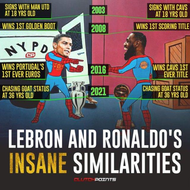 这也不是美媒第一次将两人联系在一起。30岁、33岁、35岁、生涯的每一个阶段,C罗和詹姆斯都常常进行跨界比较,甚至两人的商业价值,签约合同也会被放在一起。他们俩也都曾率领三支不同的球队夺冠,你更喜欢哪一位球星呢?