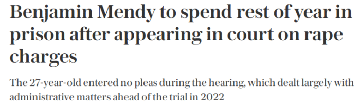 24直播网9月12日讯《每日电讯报》消息,曼城后卫本哈明-门迪今年将在监狱里度过,明年1月24日接受审判。