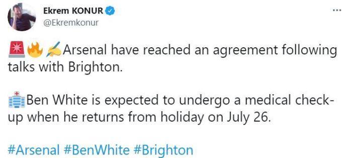 据EkremKonur报道,本-怀特将在7月26日结束度假,随机前往伦敦接受阿森纳的体检。