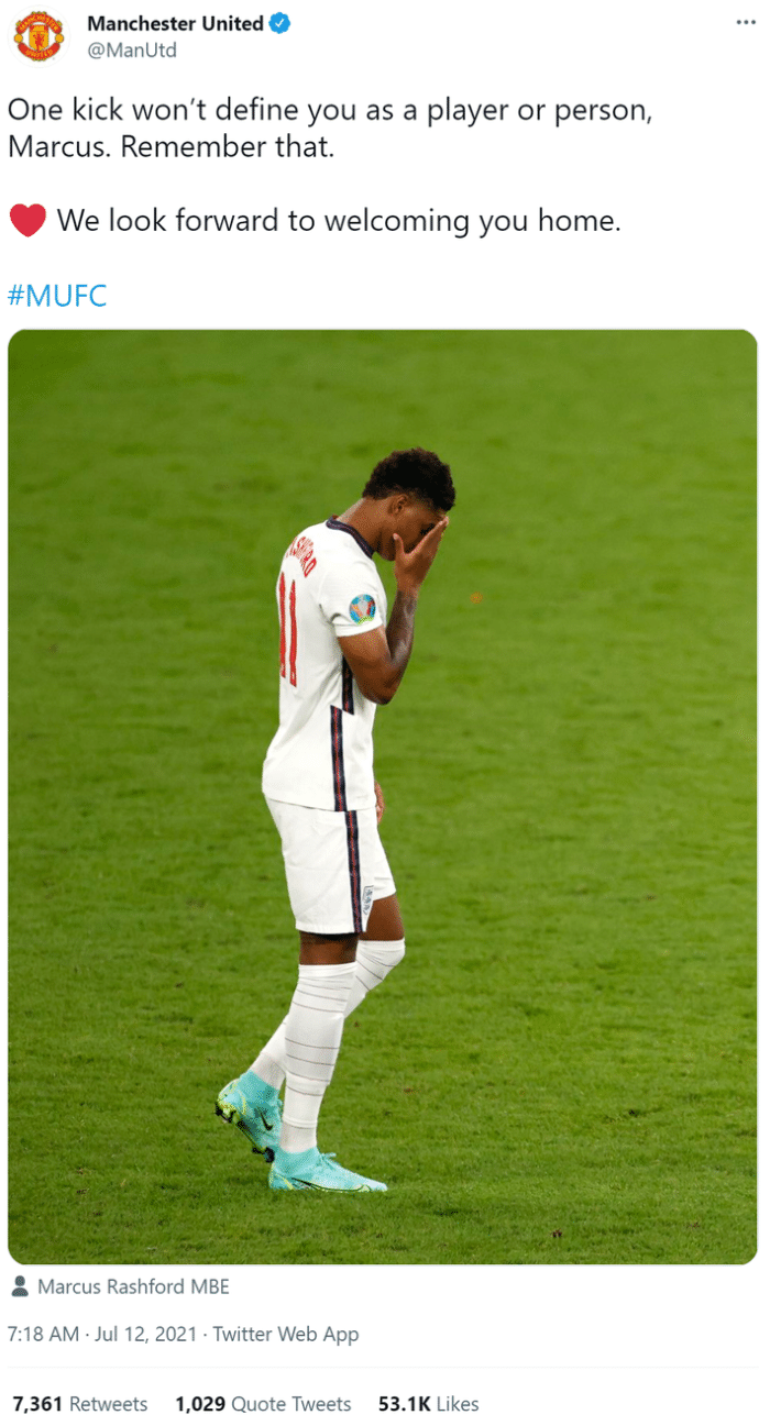 24直播网讯 今天凌晨,拉什福德在欧洲杯决赛中罚丢点球,赛后曼联官推发文安慰了这名球员。
