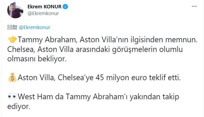 24直播网讯 据记者Ekrem Konur报道,阿斯顿维拉已经为切尔西前锋亚伯拉罕报价4500万欧元,同时西汉姆联也在关注他。