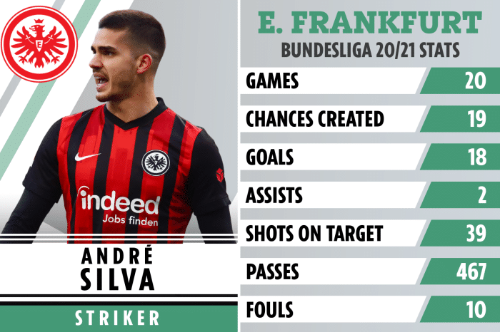 早在2017年从波尔图加盟米兰时,安德烈·席尔瓦就被传闻可能转会英超。在红黑军团,他最初也接连进球,似乎打破了9号魔咒,但第二个赛季陷入低谷,最终被租借给塞维利亚。今年9月,法兰克福买断了他,而他也重新找回最佳状态。