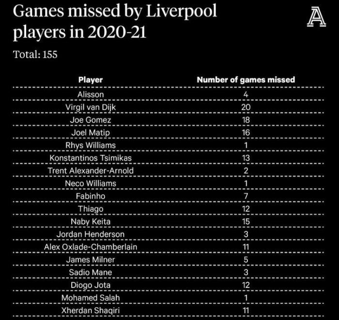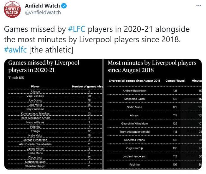 24直播网2月25日讯 根据The Athletic统计,本赛季利物浦球员缺阵合计已达155场。