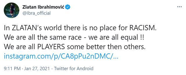 伊布随后在个人推特上发文写道:“种族主义在兹拉坦的世界里没有容身之处,我们都是同一个种族,我们都是平等的!我们都是球员,只是有些球员比另外一些出色。”