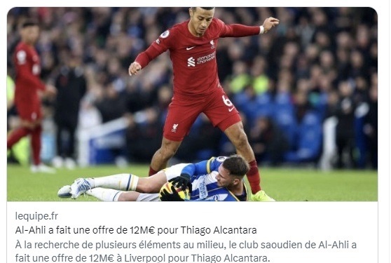 最近几个小时内,沙特联赛豪门吉达国民,已经为西班牙中场蒂亚戈向利物浦开出了1200万欧元的报价,红军正在认真考虑是否接受这份报价。吉达国民今夏已经签下了菲尔米诺、马赫雷斯、圣马克西曼、凯西、E-门迪等球员。如果蒂亚戈加盟,将会与菲尔米诺再次成为队友。