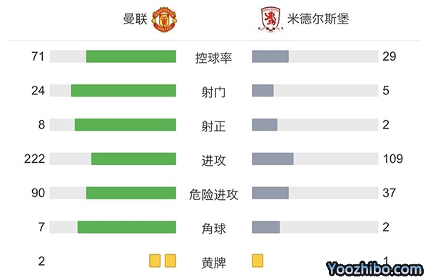第25分钟,B费长传给左路的桑乔,后者禁区内小角度抽射将球打进,曼联1-0米德尔斯堡。
