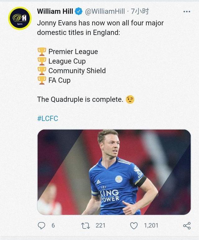 在2018年夏天加盟莱斯特城之前,埃文斯曾经跟随曼联获得过4次英超冠军,3次联赛杯冠军和5次社区盾杯的冠军,唯独缺少了足总杯冠军。曼联最近的一次获得足总杯冠军是在2015/16赛季,而埃文斯恰巧是在2015年离开老特拉福德的。在跟随莱斯特城获得足总杯后,埃文斯也是收获了英格兰国内全部四项赛事的冠军。