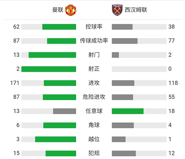 全场比赛结束,曼联主场1-0战胜西汉姆联。